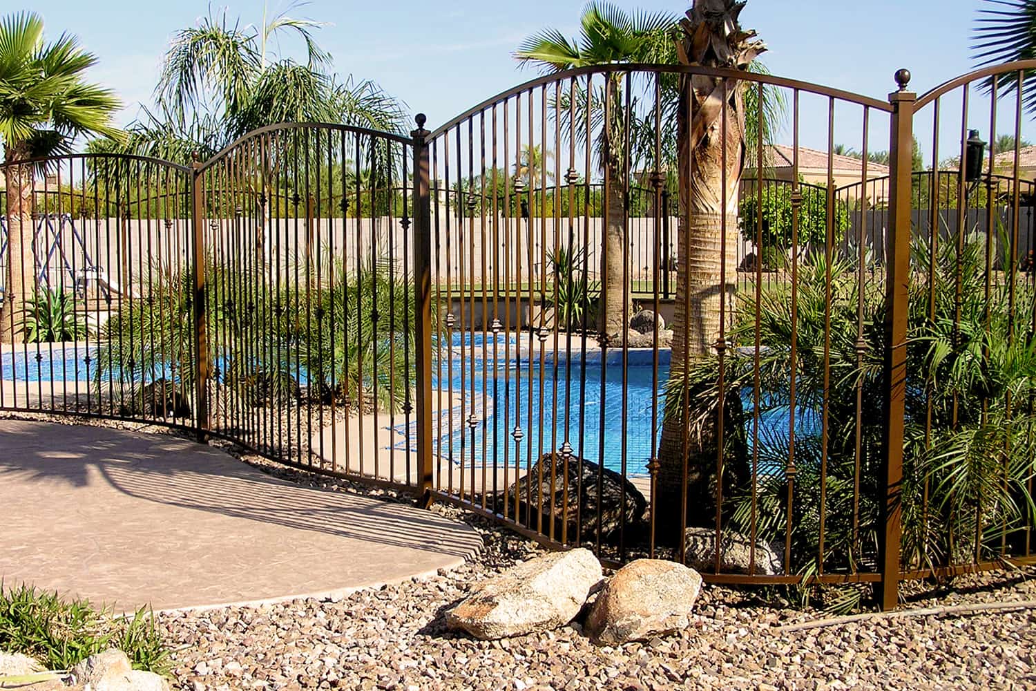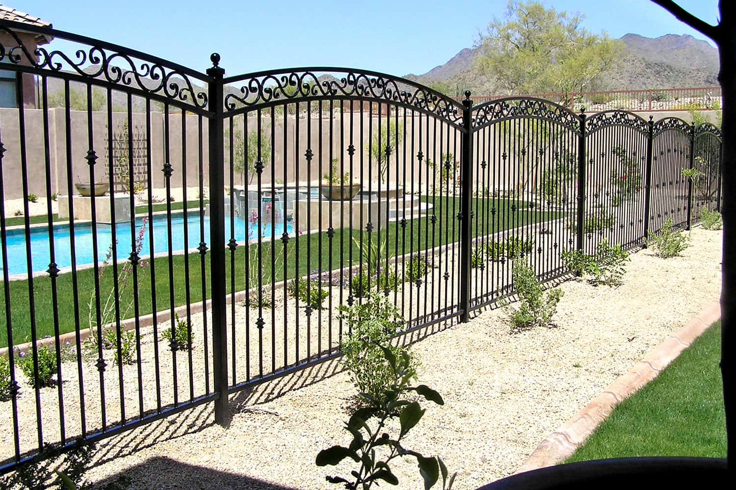 The hand-hammered Italian scrolls arched throughout this fencing help set off this beautifully landscaped backyard.